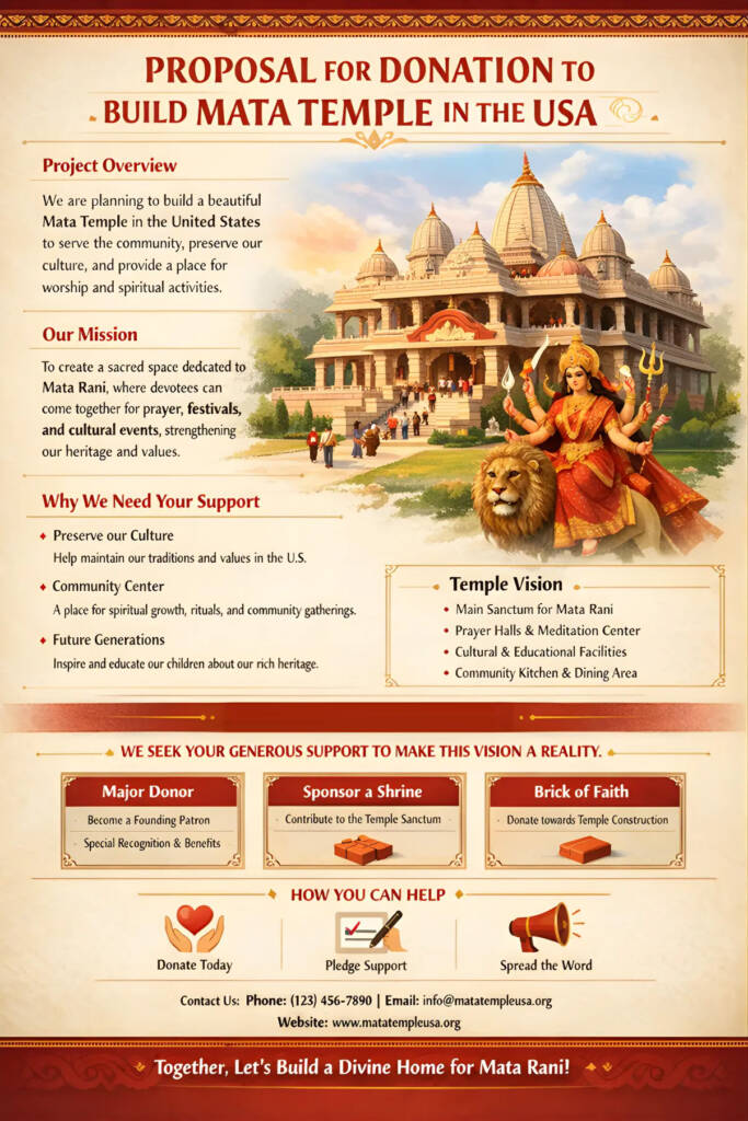 This proposal seeks your generous support and donation for the construction of a Mata Temple in the United States. The temple is envisioned as a spiritual, cultural, and community-centered institution that will preserve Sanatan Dharma values, promote cultural harmony, and serve as a place of worship, education, and social service for present and future generations.